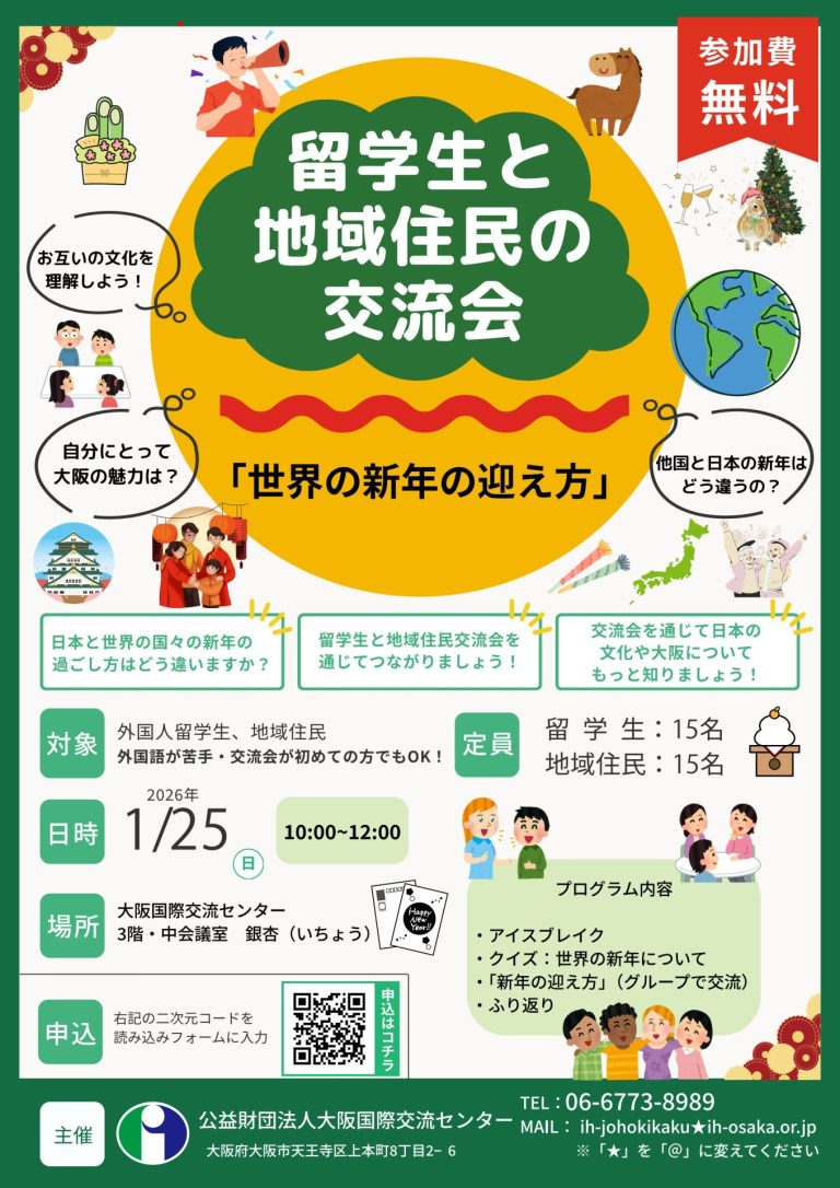 〈今月は1月25日開催〉あべのキューズモール サンキューサンデー💁毎週最終日曜日はサンキューサンデー!とい …続きを読む〈開催中🛀〉激アツ‼スパワールドのアウフグースイベント!ドイツ発祥のサウナ文化、ロウリュで発生し …続きを読む〈1月25日開催〉🌏留学生と地域住民の交流会「世界の新年の迎え方」「世界の新年の迎え方」についてクイズに答 …続きを読む〈1月21日開催〉💁災害時外国人支援ボランティア募集説明会〈公財〉大阪国際交流センターでは、災害時 …続きを読む〈12月23日~2026年1月12日開催〉企画展~午~ ウマすぎちゃって、ごめんなさい天王寺動物園の本領発揮!? 2026年の …続きを読む〈12月12日~14日・19日~21日開催〉💁微の美・微生物展🖌まさかの「微生物」がテーマの展示です。微 …続きを読む〈12月21日開催〉🎅あべちかにサンタクロースがやってくる!あべちかにやってくるサンタクロースに会い …続きを読む〈12月21日開催・要ご予約〉💁マイクロアグレッション(無自覚の差別)とは?~無自覚の偏見によって無意識に誰かを傷つ …続きを読む〈12月20日開催・要ご予約〉🎄クリスマス楽器体験会🎅クリスマス前にぴったりのウキウキで楽しい …続きを読むBILLIKEN CITY 新世界・あべてん 重ね絵スタンプラリーでパインアメプレゼント🍍🍬🎁スタンプ全部おすとこうなります! スタン …続きを読む〈12月21日まで〉『 生 』—命の帰るべき場所へ—画家 真 (SHIN)の個展を天王寺にて …続きを読む〈12月25日まで〉クリスマスマーケットin大阪🎄ええやんまちフェス まるっと文化祭20 …続きを読む123…39›ええやんまちフェス