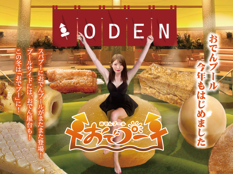おでんのフロートが浮かび、まるでプール全体がおでん鍋になったみたい!なSPAWORLD HOTEL&RESORTに遊びに来てください!屋台ではおでんの販売も。