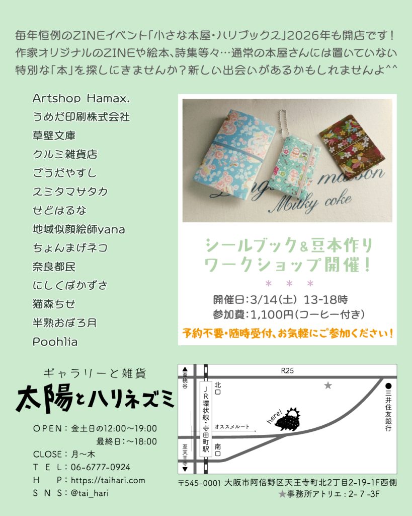 〈2月6日~3月29日の金土日曜日開催〉📚小さな本屋・ハリブックス🦔
