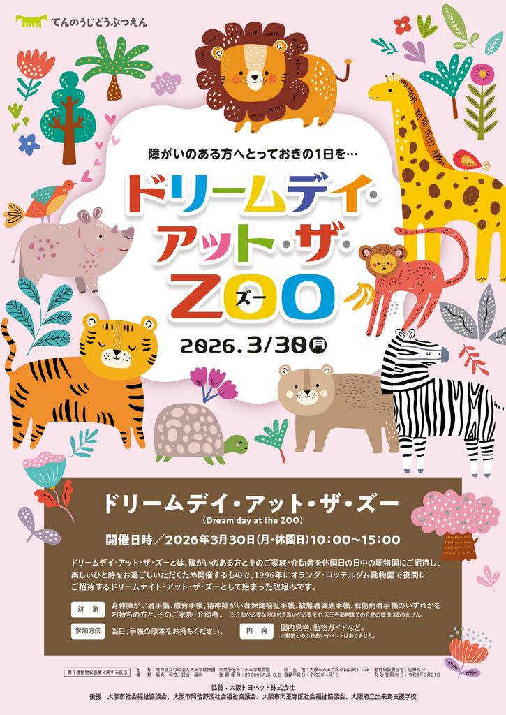 天王寺動物園では、3月30日(月)に開催する「ドリームデイ・アット・ザ・ズー」で障害のある方とそのご家族・介助者に、ゆっくり動物園を楽しんでいただくことを目的として無料でご招待します。