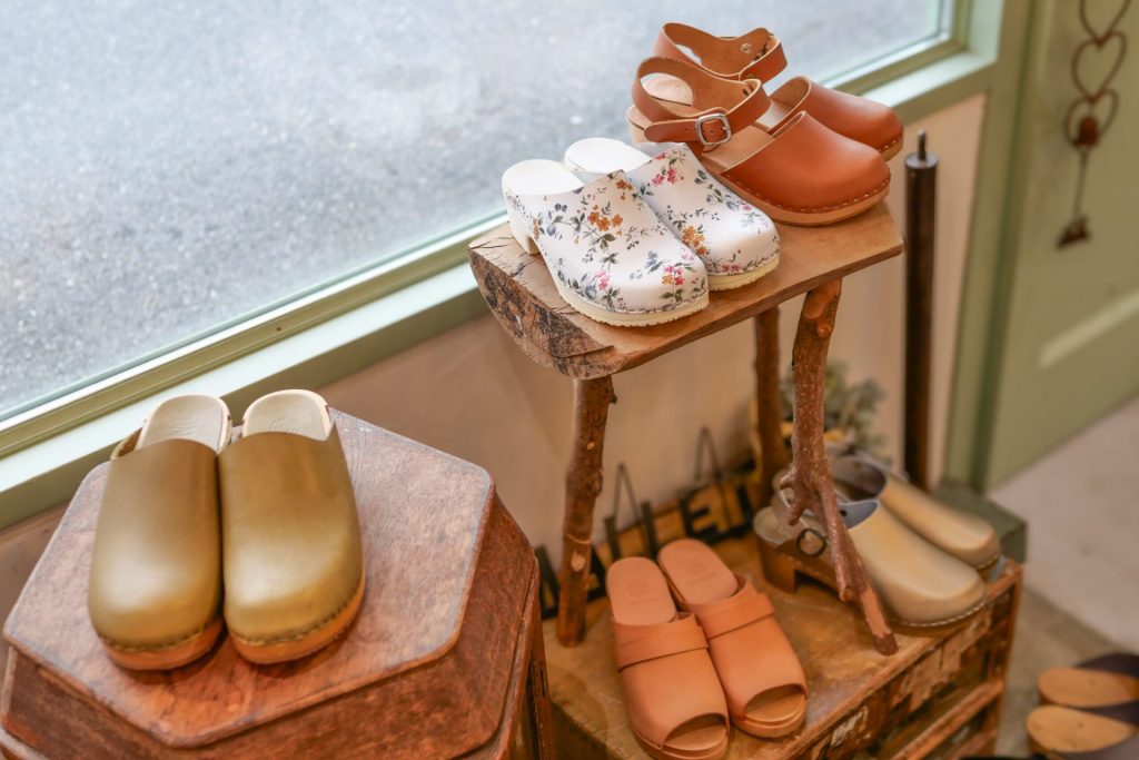 春の装いにぴったりなウッドクロッグが、ずらりと並びます。